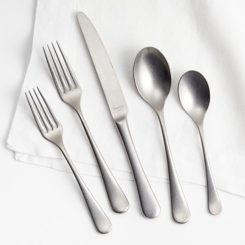 Tumbled to create a pebble-smooth surface, this place setting is finished to a vintage-inspired soft luster. This five-piece stainless steel flatware set is well-balanced with a comfortable heft. A pleasure to hold and behold, this versatile, classically styled pattern designed by Robert Welch complements any table setting.