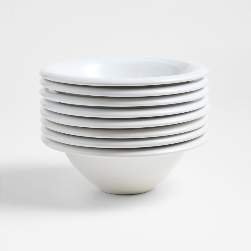 Inspired by our bestselling Caesna flatware, our Caesna dinnerware and serveware collection sets the table with the same soft curves and restaurant quality. These eight bowls' bright white finish makes a masterpiece of everyday or elegant meals. Glossy glaze coats the interiors and the generous rims, providing subtle contrast to the matte exteriors. A fresh take on classic white ceramics, the collection sets a refined, modern table with any of our exclusive glassware and table linens—we especially like it with Marin.