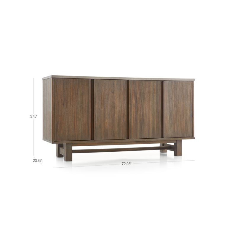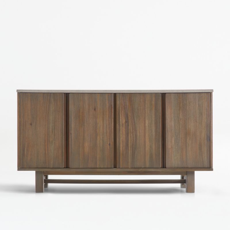 Slats of hand-finished acacia wood piece together to create a striking tableau of nuanced color and grain pattern in our striking Caicos sideboard. Designed with flat-front doors to make the most of the wood's natural variations, the sideboard takes on a grey tint to complement its cement top, distinguished by its own unique markings and color variations. A trestle base lightens the look of the sideboard that opens to store dining or living room essentials on adjustable shelves.