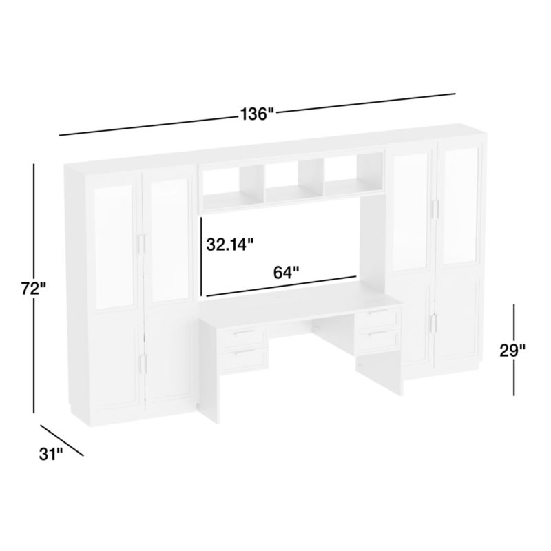 | | Set: 1 desk, 2 wood-door bases, 2 glass-door hutches, 1 wall-mounted shelf |