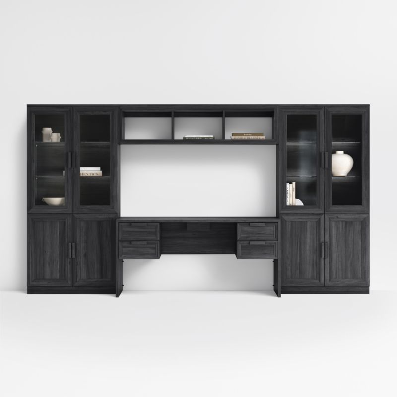 Calypso enhances the home office with a streamlined design and the beauty of elm wood finished in smart black. This set gathers together everything you need for a gorgeous and fully functioning office. In the center, a desk floats two sets of stacked drawers and includes integrated power. Flanking the desk are two-piece units each consisting of a wood-door base and glass-door hutch for a mix of open and closed storage. A wall-mounted shelf spans the bookcases, offering three open cubbies. Stepped detailing adds linear design notes, while wirebrushing and a charcoal finish bring out the beautiful elm grain.