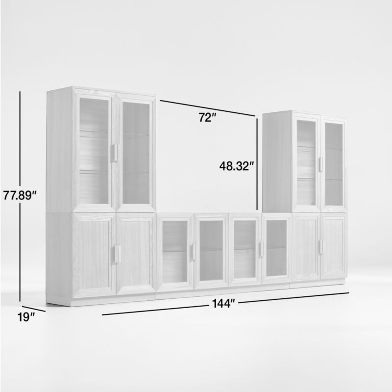 Inspired by classic barrister cabinetry, our Calypso collection opens up living room storage with a light and airy look. Elm wood frames each piece in this roomy configuration with stepped trim and black finish to bring out the grain. Consisting of a media console flanked by two wood-door cabinet bases topped with glass-door hutches, the arrangement mixes open and closed storage with clear glass panes and shelves and richly grained wood doors. Recessed plinth bases and blocky pulls add modern details to this timelessly styled black storage configuration, a Crate & Barrel exclusive.