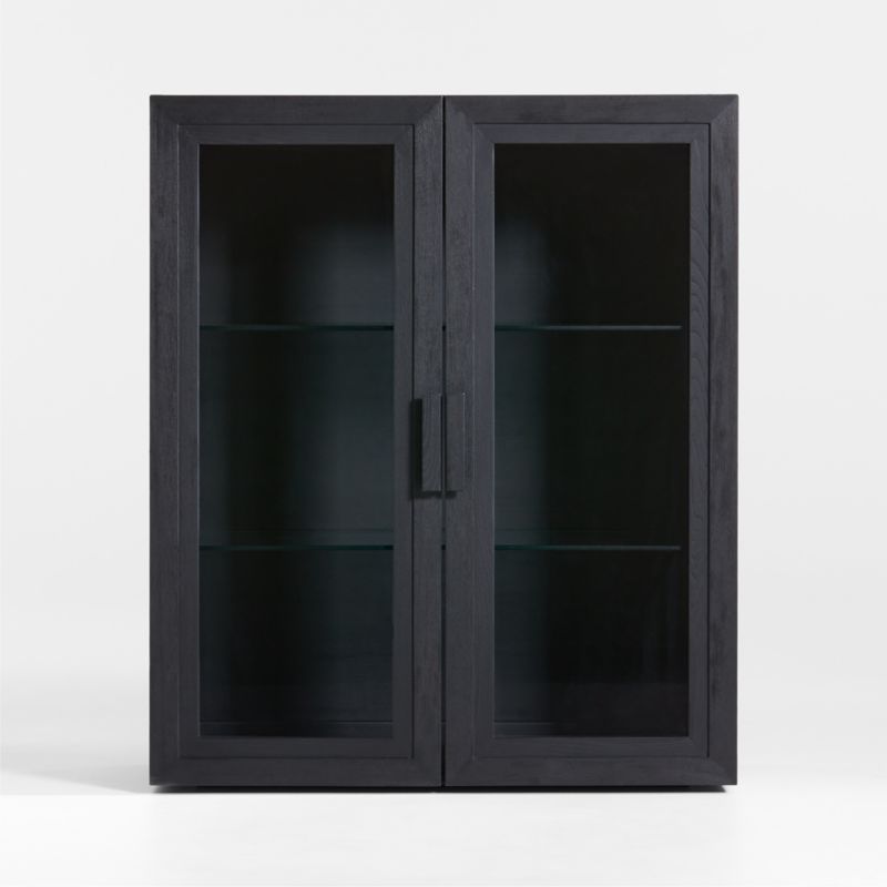 Inspired by vintage barrister cabinetry, our Calypso modular storage system lets you customize storage in style. The bookcase hutch sheds light on media components, books or dinnerware with glass doors and two adjustable glass shelves. Detailed with stepped trim, the elm wood frame is heavily wirebrushed and given a black finish to bring out the wood grain. Blocky pulls add modern details to this timelessly styled modular hutch, a Crate & Barrel exclusive.