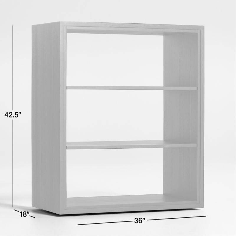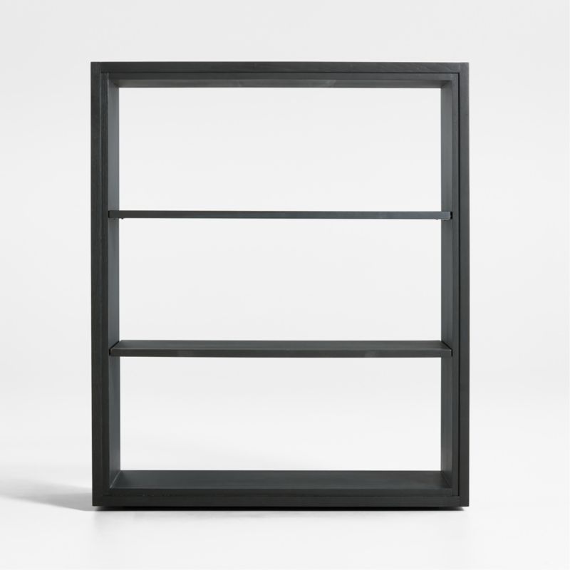 Inspired by vintage barrister cabinetry, our Calypso modular storage system lets you customize storage in style. The bookcase hutch provides open display of books, collectibles or media components with two adjustable shelves. Detailed with stepped trim, the elm wood frame is heavily wirebrushed and given a black finish to bring out the wood grain. This timelessly styled open modular hutch is a Crate & Barrel exclusive.