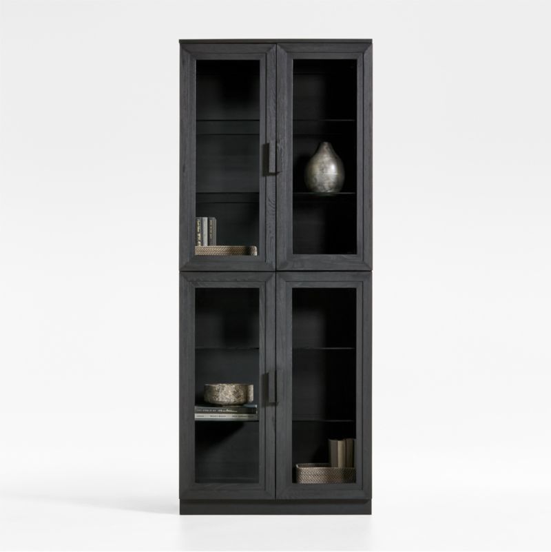 Inspired by vintage barrister cabinetry, our Calypso modular storage system lets you customize storage in style. This unit stacks two bookcase hutches, shedding light on media components, books or dinnerware with glass doors and adjustable glass shelves. Detailed with stepped trim, the elm wood frame is heavily wirebrushed and given a black finish to bring out the wood grain. Blocky pulls add modern details to this timelessly styled modular storage solution, a Crate & Barrel exclusive.