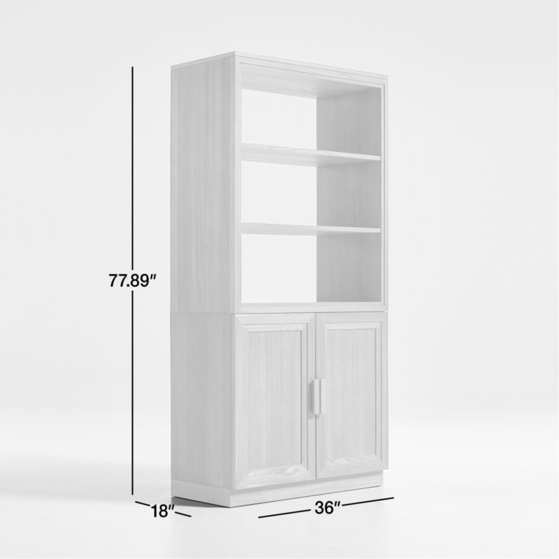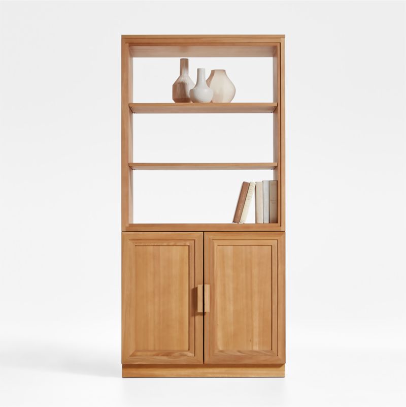 Inspired by classic barrister cabinetry, our Calypso collection opens up living room storage with a light and airy look. Elm wood frames each piece in this roomy configuration with stepped trim and a natural finish to bring out the grain. The two-piece unit places a bookshelf hutch atop a wood-door cabinet base for a mix of open and closed storage of books, media components and collectibles. A recessed plinth base and blocky pulls add modern details to this timelessly styled wood storage configuration, a Crate & Barrel exclusive.