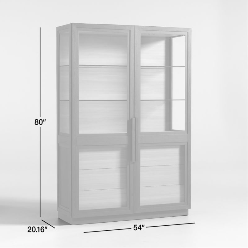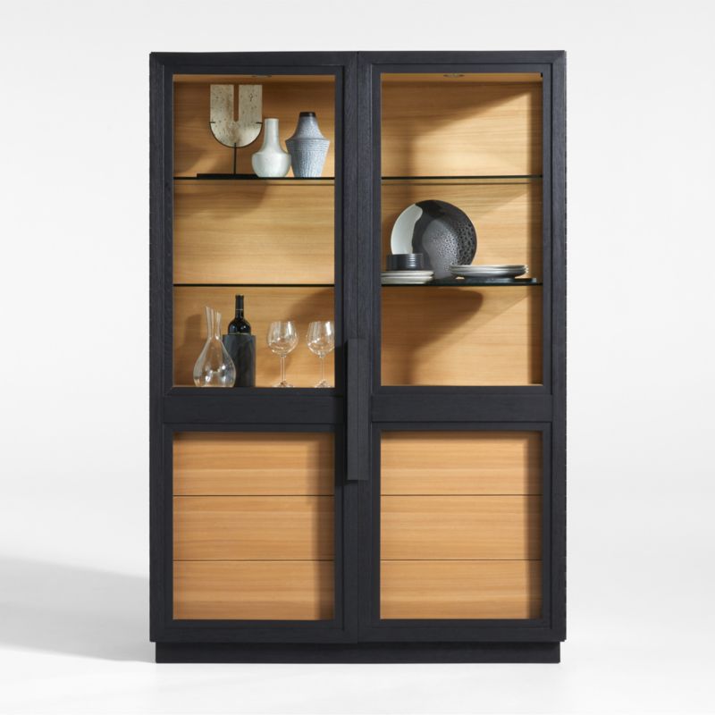 A curio cabinet for contemporary homes, our two-toned Calypso wood cabinet opens up storage with a light and airy look. Full-length glass doors, see-through glass side panels and glass shelves shed light on books, art glass, or barware. The ebonized elm frame opens to a natural-finished interior lit by dimmer-controlled lights and replete with glass shelves and a suite of five drawers, flat-fronted to show off the beautiful wood grain. A recessed plinth base and blocky pulls add modern details to this spacious cabinet, a Crate & Barrel exclusive.