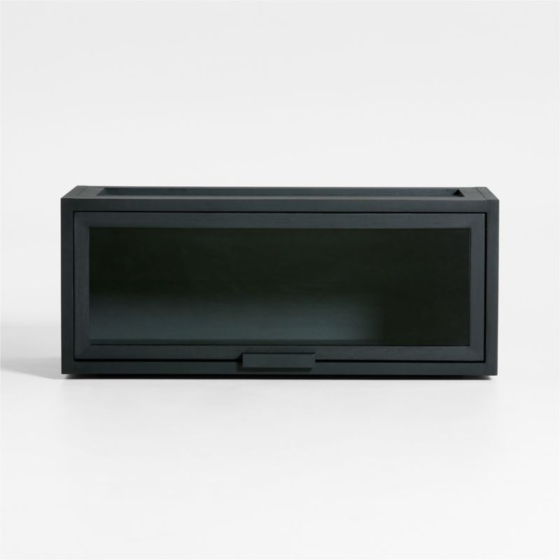 Inspired by vintage barrister cabinetry, our Calypso modular storage system lets you customize storage in style. The single storage unit has a glass pocket door that flips up to fill the cabinet with a media component, books or collectibles. Detailed with stepped trim, the elm wood frame is heavily wirebrushed and given a black finish to bring out the wood grain. A blocky pull adds modern details to this timelessly styled storage unit, a Crate & Barrel exclusive.