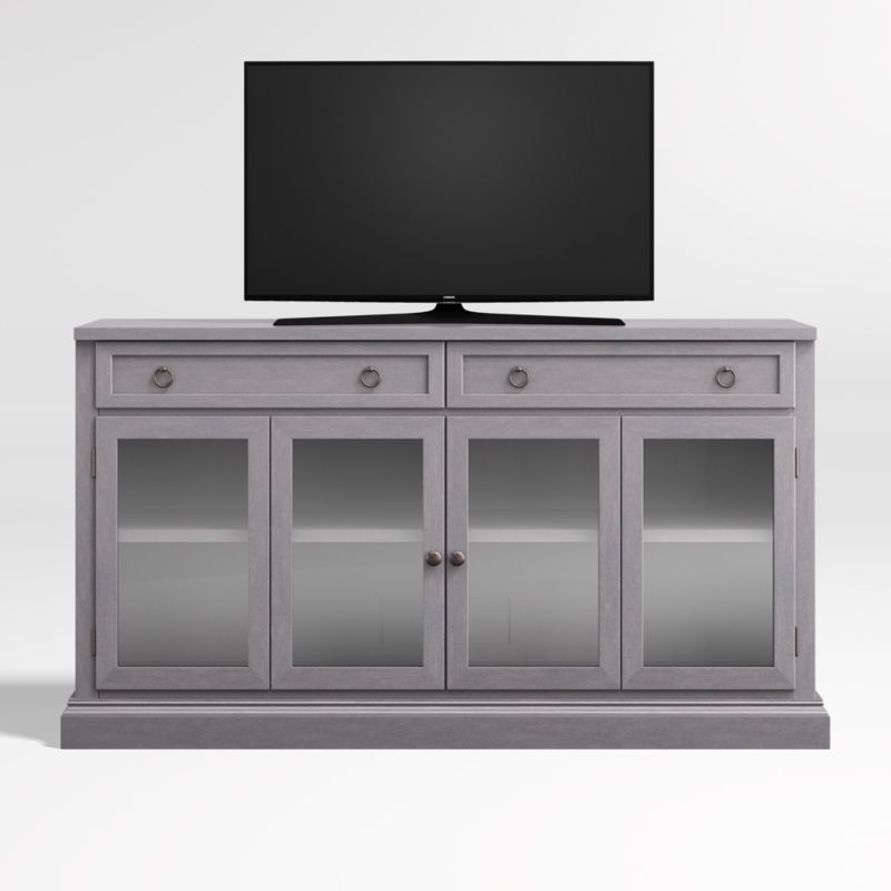 Making an extended cameo appearance in the living room, family room or den, this versatile media console with glass doors pairs with other Cameo modular pieces to create customized storage, media configurations and display of prized possessions. The well-proportioned TV stand is handpainted by Italian artisans with a rich, multi-step dove grey finish. Warm white interiors add contrast. The modular media stand with double bi-fold doors and two storage drawers stands alone or supports the coordinating Cameo media hutch or glass door hutch. The Cameo media console is a Crate and Barrel exclusive.