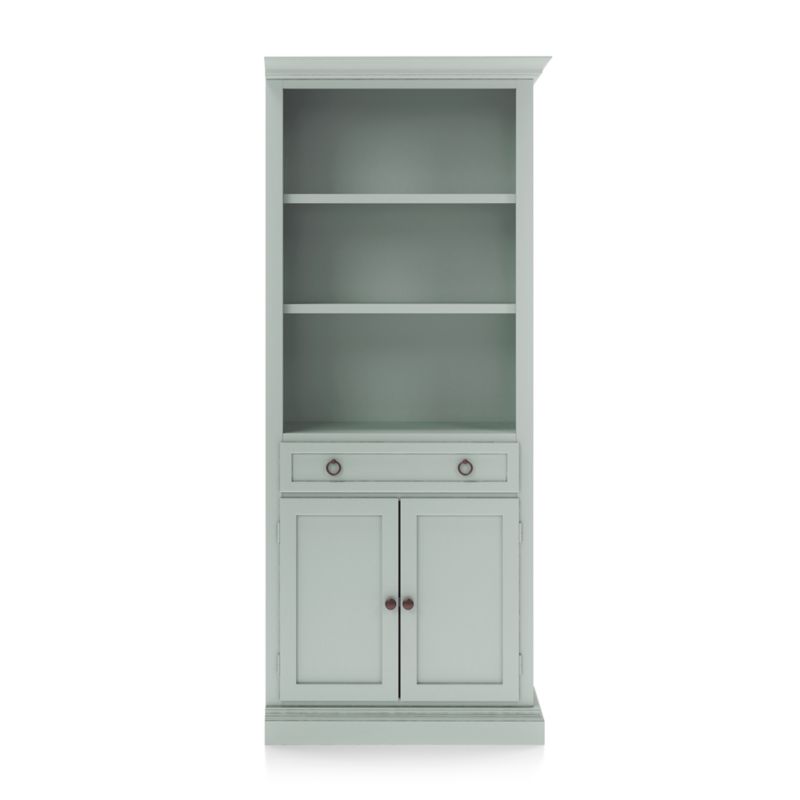 The modular right storage bookcase with two shelves and an enclosed cabinet with drawer for games, remotes and DVDs combines with the media storage pieces into a custom wall unit. The Cameo Blue Grey Storage Bookcase with Right Crown is a Crate & Barrel exclusive.