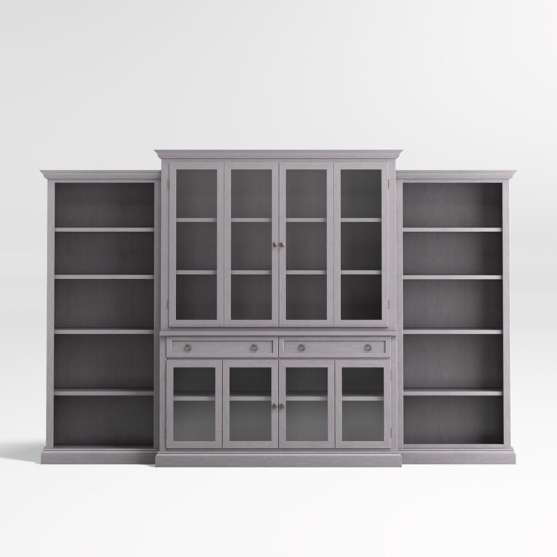 Making an extended cameo appearance in the living room, family room or den, this versatile modular wall unit configures beautifully for customized storage, media display and showing off your favorite things. Each well-proportioned piece is handpainted by Italian artisans in a rich, multi-step dove grey finish. The media console with double bi-fold doors and two storage drawers supports the media hutch with glass doors, crown molding and four shelves, adding drama and height to media configurations. The four-shelf open bookcases stand alone or flank the main media storage pieces for the appearance of a custom built-in, with the hutch rising tall above the bookcases. The Cameo Modular 4-Piece Dove Grey Glass Door Wall Unit with Open Bookcases is a Crate and Barrel exclusive.