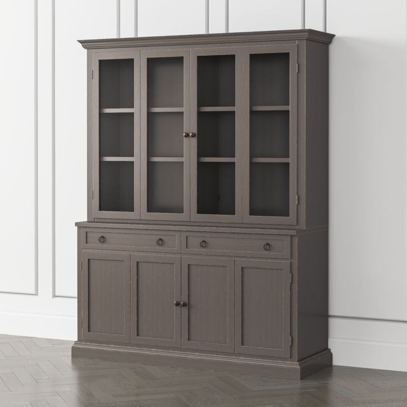 The TV stand with double bi-fold doors and two storage drawers supports the modular hutch with crown molding, glass-paned doors and four shelves, adding height and drama to media configurations and collectible displays. The Cameo Grey Modular 2-Piece Glass Door Wall Unit is a Crate & Barrel exclusive.