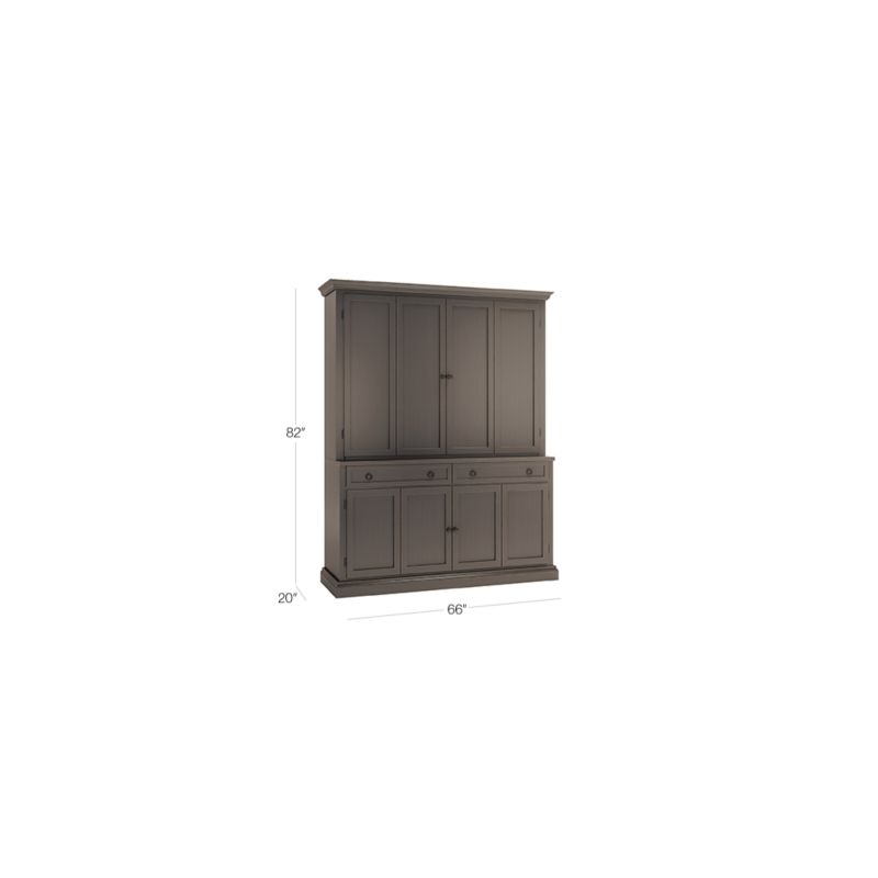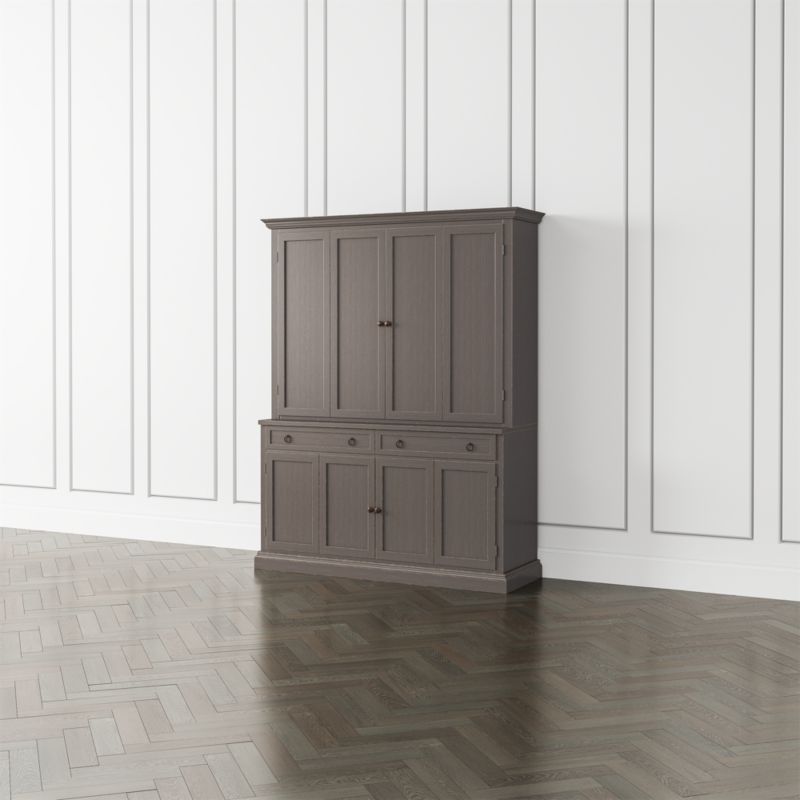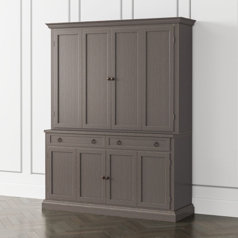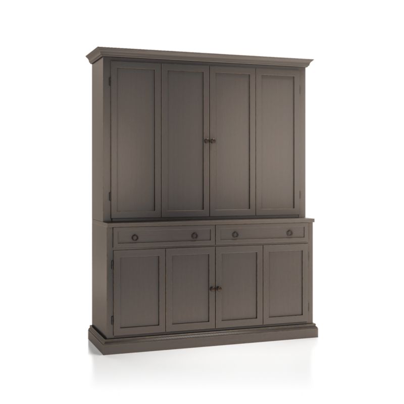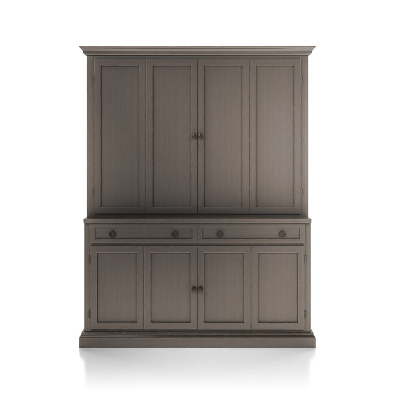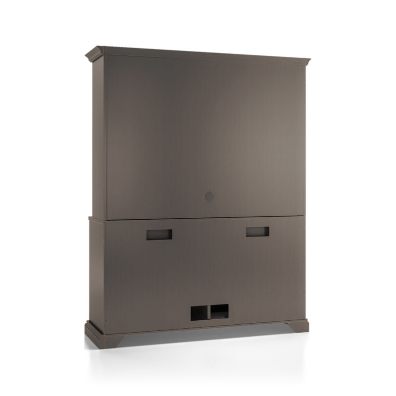 The modular TV stand with double bi-fold doors and two storage drawers supports the media/TV hutch with crown molding, adding height and drama to media configurations while concealing the TV when closed. Cameo 2-Piece Grigio Entertainment Center with Wood Doors is a Crate & Barrel exclusive.