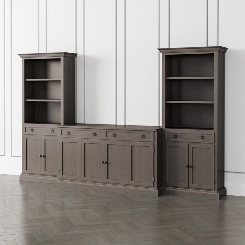 The two-shelf storage bookcases with enclosed cabinets and drawers stand alone or surround the main media pieces for a custom built-in effect, with the hutch elevated above the cases. The Cameo Grigio 3-Piece Entertainment Center with Storage Bookcases is a Crate & Barrel exclusive.
