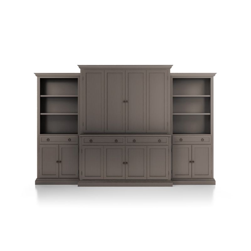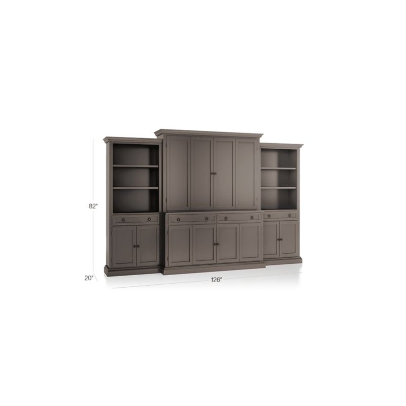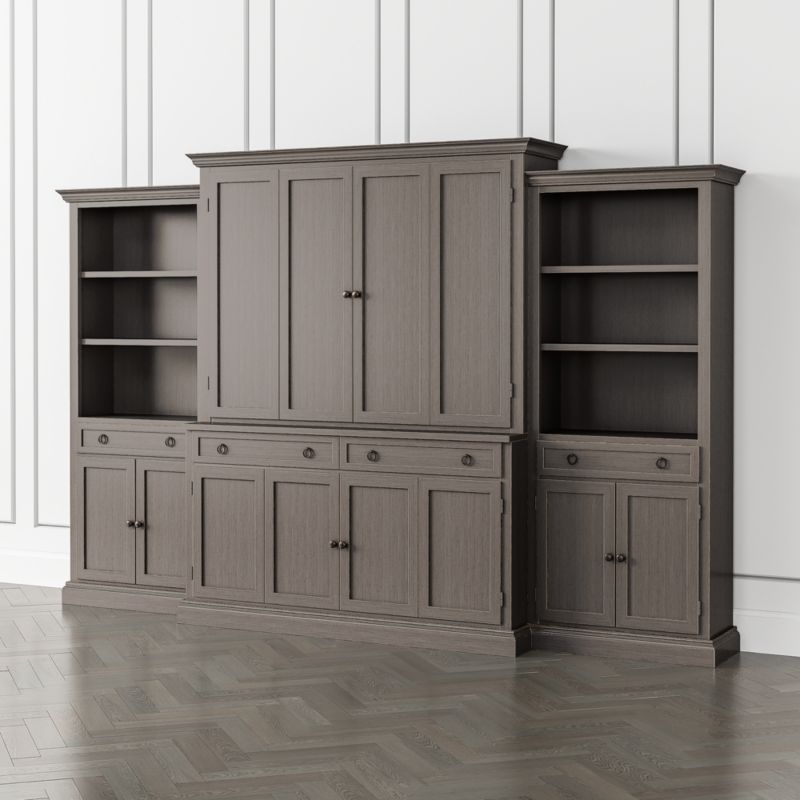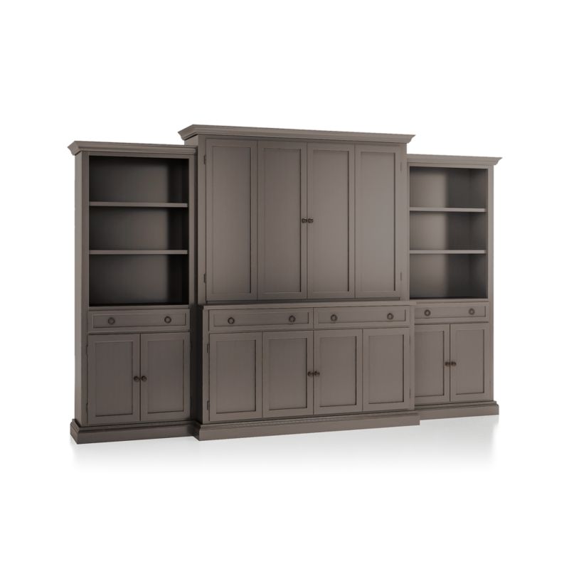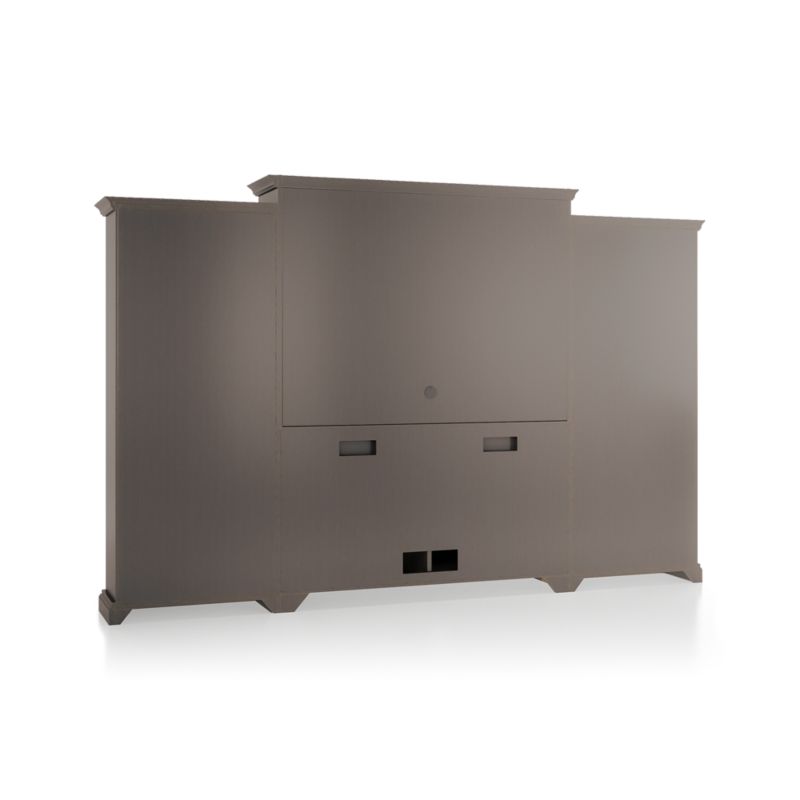 The TV stand with double bi-fold doors and two storage drawers supports the media/TV hutch with crown molding, adding drama and height to media configurations and hiding the TV when not in use. The two-shelf storage bookcases with enclosed cabinets and drawers stand alone or surround the main media pieces for a custom built-in effect, with the hutch elevated above the cases. The Cameo Grigio 4-Piece Entertainment Center with Storage Bookcase is a Crate & Barrel exclusive.