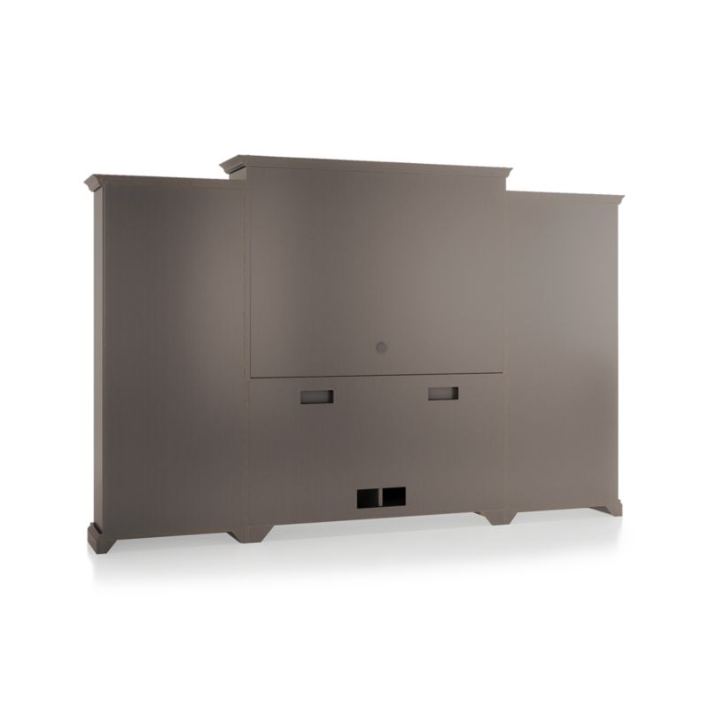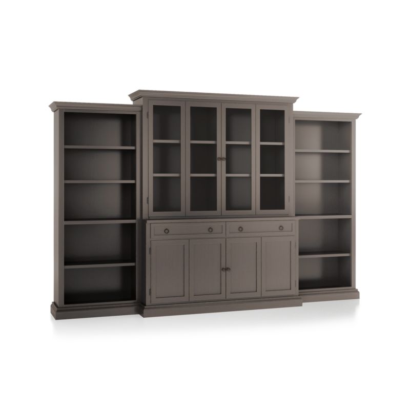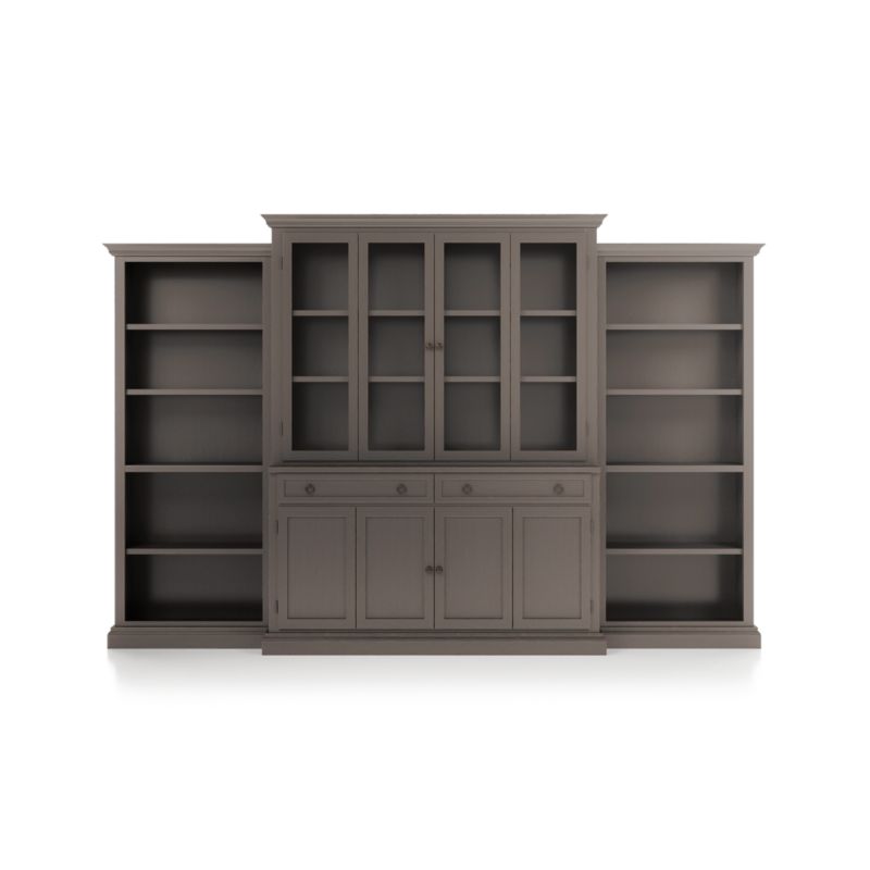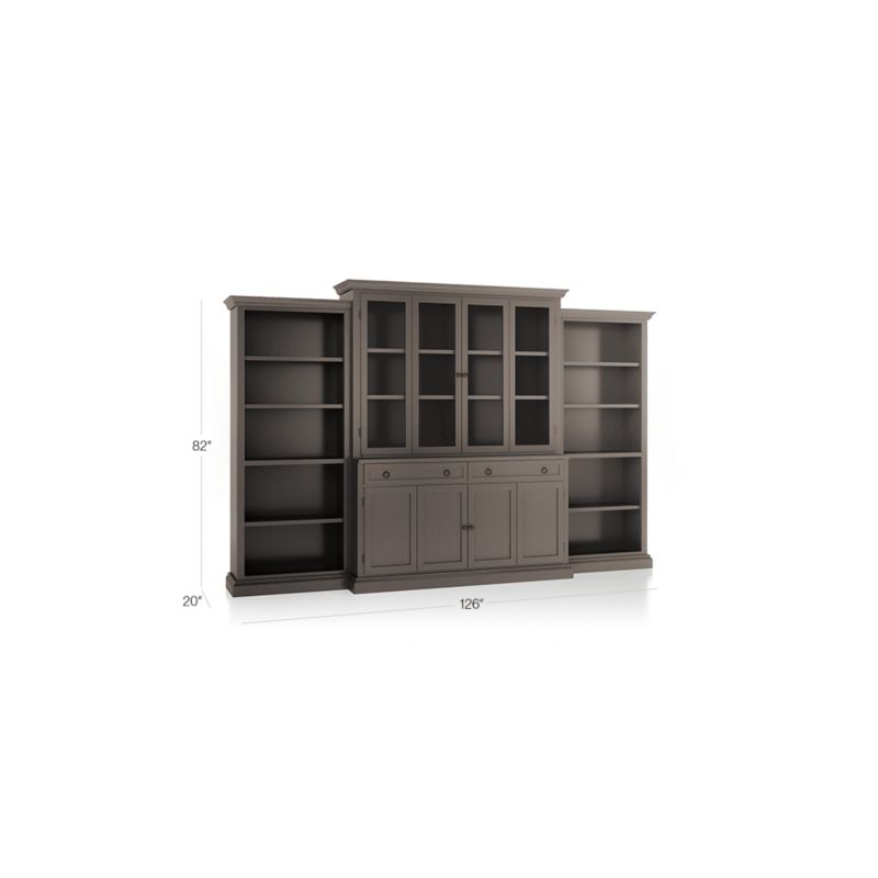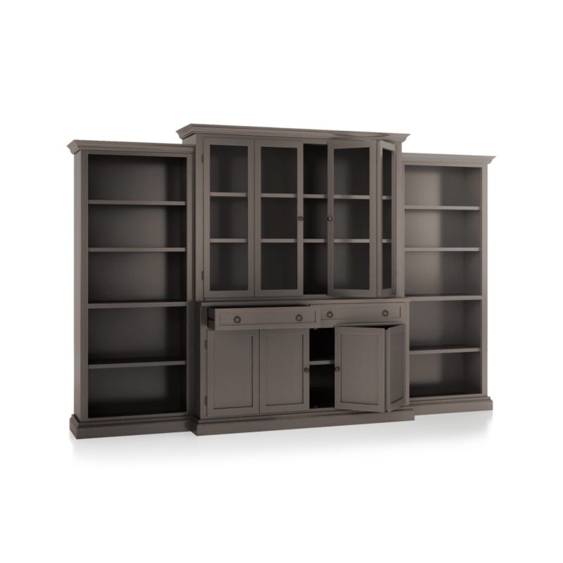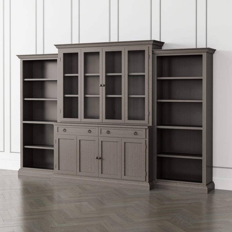 The media console with double bi-fold doors and two storage drawers supports the media hutch with glass doors, crown molding and four shelves, adding drama and height to media configurations. The four-shelf open bookcases stand alone or flank the main media storage pieces for the appearance of a custom built-in, with the hutch rising tall above the bookcases. The Cameo Grigio 4-Piece Glass and Wood Door Wall Unit with Open Bookcases is a Crate & Barrel exclusive.