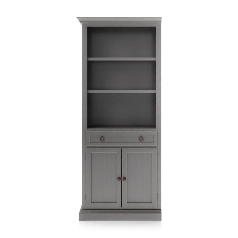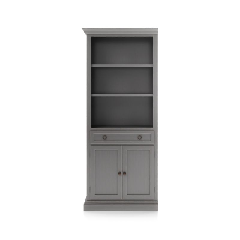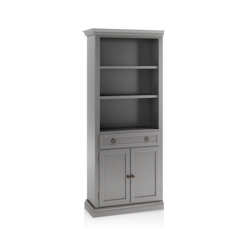 The modular left storage bookcase with two shelves and an enclosed cabinet with drawer for games, remotes and DVDs combines with the media storage pieces into a custom wall unit. The Cameo Grigio Storage Bookcase with Left Crown is a Crate & Barrel exclusive.