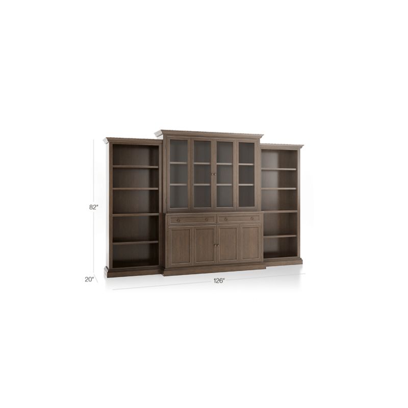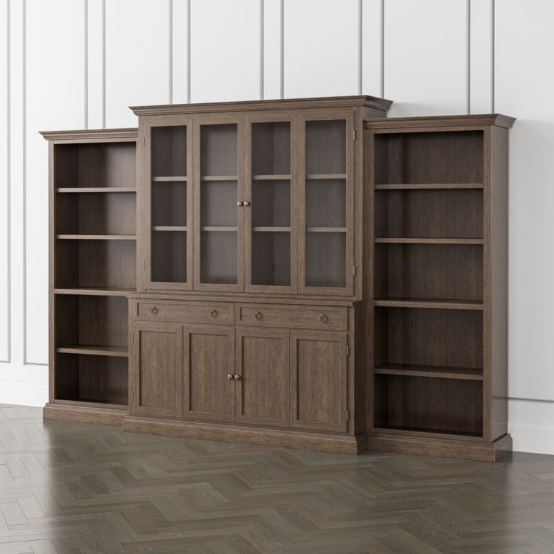 The media console with double bi-fold doors and two storage drawers supports the media hutch with glass doors, crown molding and four shelves, adding drama and height to media configurations. The four-shelf open bookcases stand alone or flank the main media storage pieces for the appearance of a custom built-in, with the hutch rising tall above the bookcases. The Cameo Pinot Lancaster 4-Piece Glass and Wood Door Wall Unit with Open Bookcases is a Crate & Barrel exclusive.