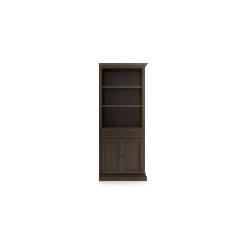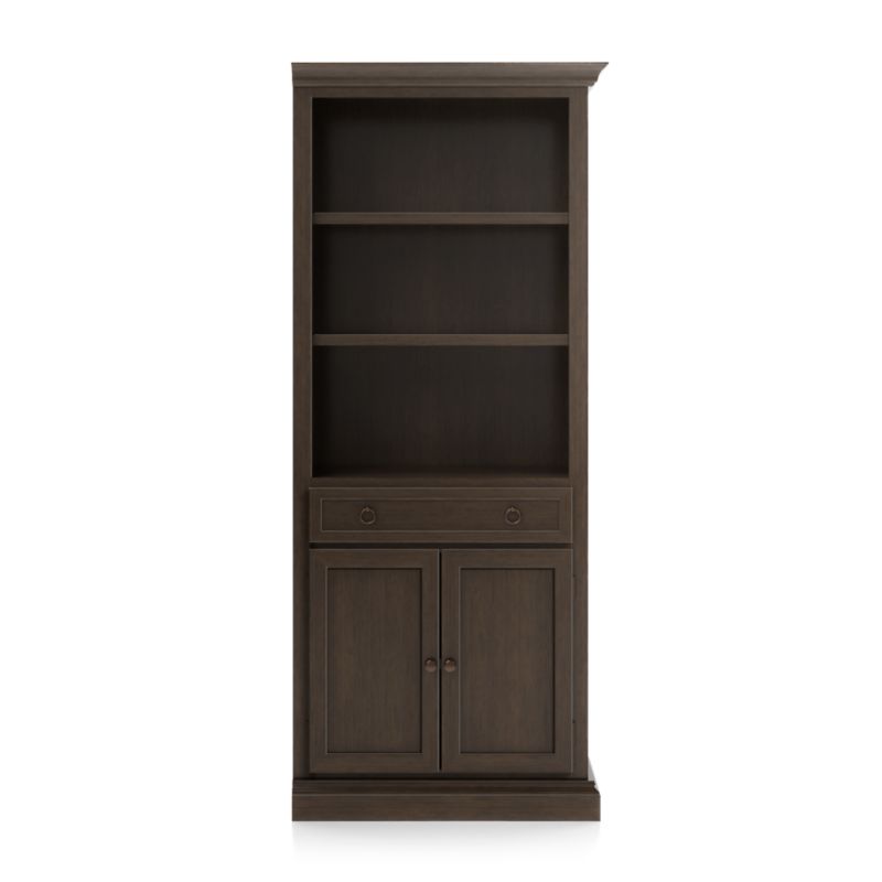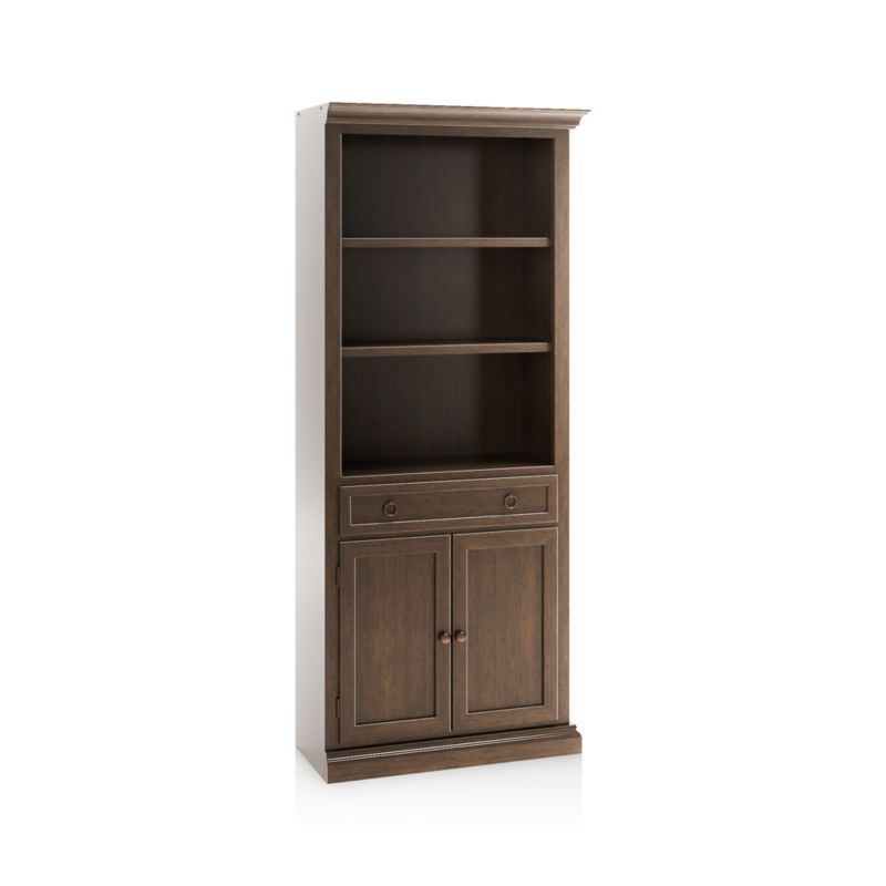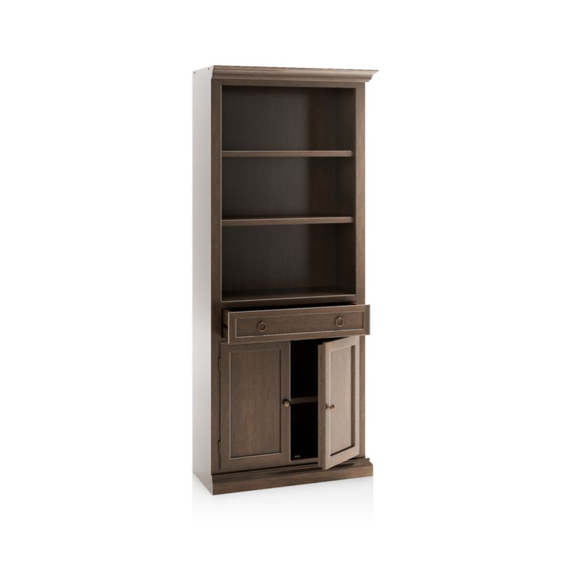 The modular right storage bookcase with two shelves and an enclosed cabinet with drawer for games, remotes and DVDs combines with the media storage pieces into a custom wall unit. The Cameo Pinot Lancaster Storage Bookcase with Right Crown is a Crate & Barrel exclusive.