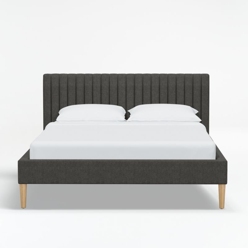 Our Camilla bed graces the bedroom with clean lines and a fully upholstered frame. Each made-to-order bed is hand tailored in a charcoal grey linen-blend fabric with vertical channel tufting on the headboard and seamless coverage along the rails. Without need of a box spring, the platform bed nestles a mattress for a contemporary, low-profile look. Conical ash legs elevate the design with a natural wood finish. Fully upholstered in the back, the bed can be positioned to best suit your decor. The Camilla bed is a Crate & Barrel exclusive.