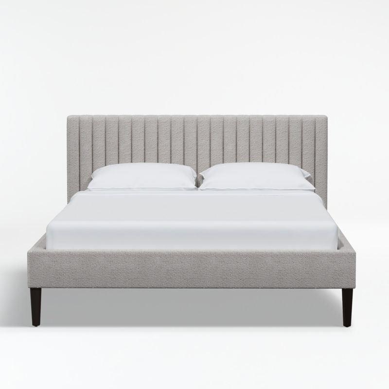 Our Camilla bed graces the bedroom with clean lines and a fully upholstered frame. Each made-to-order bed is hand tailored in a light grey bouclé fabric with vertical channel tufting on the headboard and seamless coverage along the rails. Without need of a box spring, the platform bed nestles a mattress for a contemporary, low-profile look. Conical ash legs elevate the design with a smart espresso finish. Fully upholstered in the back, the bed can be positioned to best suit your decor. The Camilla bed is a Crate & Barrel exclusive.