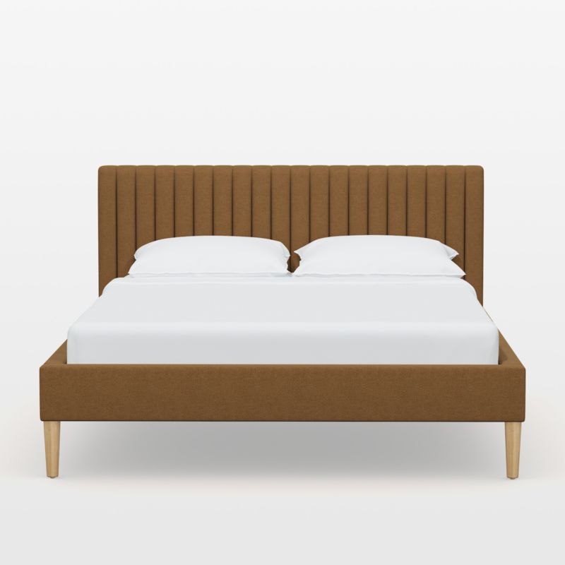 Our Camille bed graces the bedroom with clean lines and a fully upholstered frame. Each made-to-order bed is hand tailored in a warm brown linen-blend fabric with vertical channel tufting on the headboard and seamless coverage along the rails. Without need of a box spring, the platform bed nestles a mattress for a contemporary, low-profile look. Conical ash legs elevate the design with a natural wood finish. Fully upholstered in the back, the bed can be positioned to best suit your decor. The Camilla bed is a Crate & Barrel exclusive.