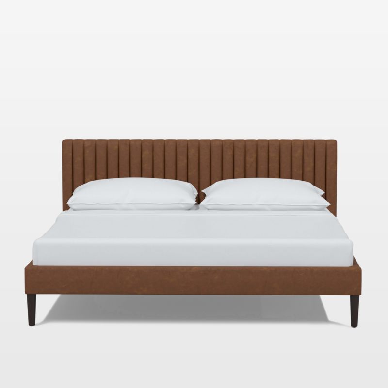 Our Camilla bed graces the bedroom with clean lines and a fully upholstered frame. Each made-to-order bed is hand tailored in saddle brown faux leather with vertical channel tufting on the headboard and seamless coverage along the rails. Without need of a box spring, the platform bed nestles a mattress for a contemporary, low-profile look. Conical ash wood legs elevate the design with a smart espresso finish. Fully upholstered in the back, the faux leather bed can be positioned to best suit your decor. The Camilla bed is a Crate & Barrel exclusive.