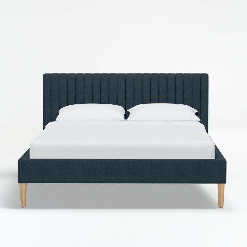 Our Camilla bed graces the bedroom with clean lines and a fully upholstered frame. Each made-to-order bed is hand tailored in a navy blue linen-blend fabric with vertical channel tufting on the headboard and seamless coverage along the rails. Without need of a box spring, the platform bed nestles a mattress for a contemporary, low-profile look. Conical ash legs elevate the design with a natural wood finish. Fully upholstered in the back, the bed can be positioned to best suit your decor. The Camilla bed is a Crate & Barrel exclusive.