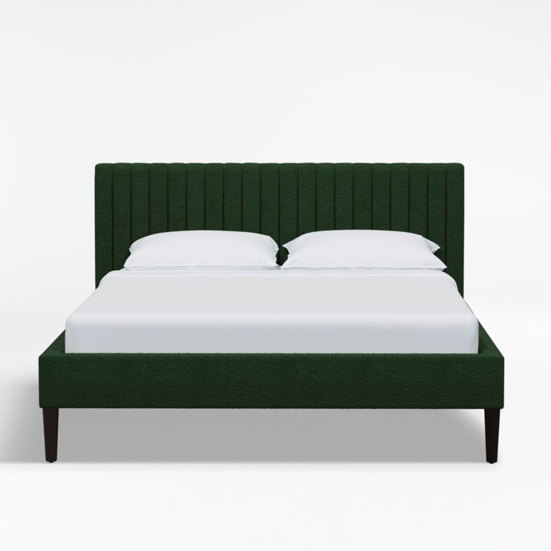 Our Camilla bed graces the bedroom with clean lines and a fully upholstered frame. Each made-to-order bed is hand tailored in a deep green bouclé fabric with vertical channel tufting on the headboard and seamless coverage along the rails. Without need of a box spring, the platform bed nestles a mattress for a contemporary, low-profile look. Conical ash legs elevate the design with a smart espresso finish. Fully upholstered in the back, the bed can be positioned to best suit your decor. The Camilla bed is a Crate & Barrel exclusive.