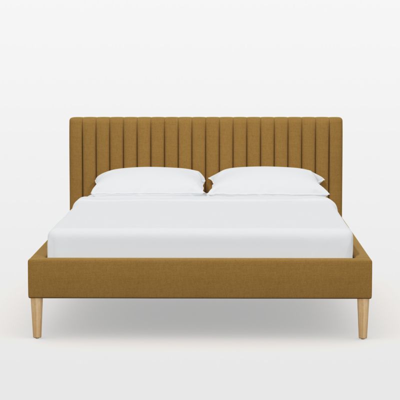 Our Camille bed graces the bedroom with clean lines and a fully upholstered frame. Each made-to-order bed is hand tailored in a caramel brown linen-blend fabric with vertical channel tufting on the headboard and seamless coverage along the rails. Without need of a box spring, the platform bed nestles a mattress for a contemporary, low-profile look. Conical ash legs elevate the design with a natural wood finish. Fully upholstered in the back, the bed can be positioned to best suit your decor. The Camilla bed is a Crate & Barrel exclusive.