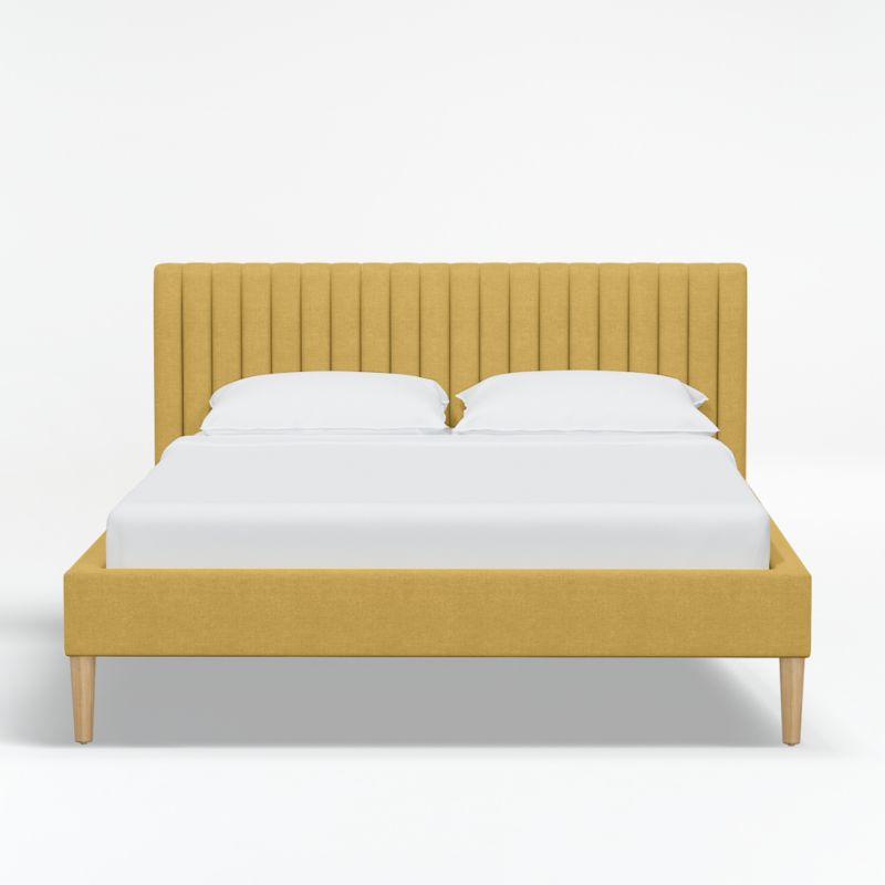 Our Camille bed graces the bedroom with clean lines and a fully upholstered frame. Each made-to-order bed is hand tailored in a golden yellow linen-blend fabric with vertical channel tufting on the headboard and seamless coverage along the rails. Without need of a box spring, the platform bed nestles a mattress for a contemporary, low-profile look. Conical ash legs elevate the design with a natural wood finish. Fully upholstered in the back, the bed can be positioned to best suit your decor. The Camilla bed is a Crate & Barrel exclusive.
