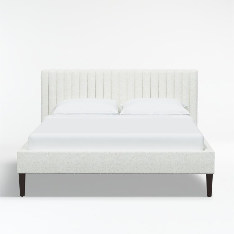 Our Camille bed graces the bedroom with clean lines and a fully upholstered frame. Each made-to-order bed is hand tailored in a white bouclé fabric with vertical channel tufting on the headboard and seamless coverage along the rails. Without need of a box spring, the platform bed nestles a mattress for a contemporary, low-profile look. Conical ash legs elevate the design with a smart espresso finish. Fully upholstered in the back, the bed can be positioned to best suit your decor. The Camilla bed is a Crate & Barrel exclusive.