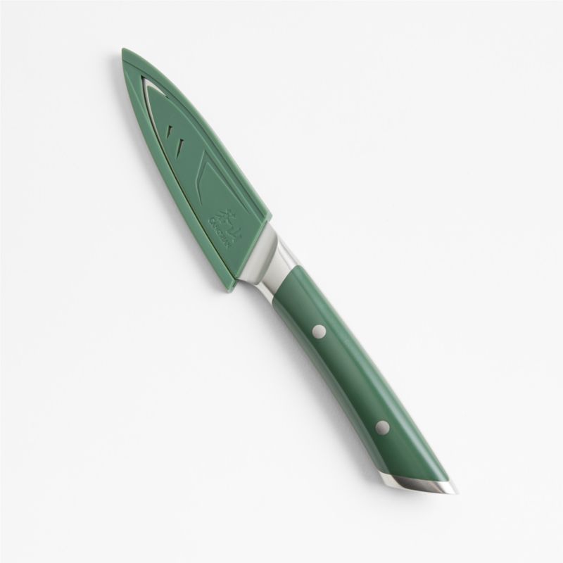 The HELENA collection from Cangshan reimagines essential knives with elegant minimalism. High-alloy German steel takes and holds a razor-sharp edge for a paring knife that maintains its hand-sharpened edge even with daily use. The forged, full-tang blade echoes the graceful curve of the green ergonomic handle. A matching sheath protects the knife in a drawer, camping pack or picnic basket.