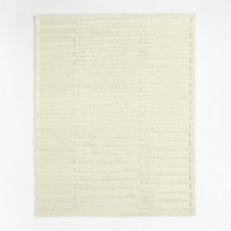 Cannet resurrects the sophisticated geometry of the modernist Bauhaus school in this handwoven rug. The result of an innovative mix of workmanship and weaving, the beige rug's intricate banded pattern takes shape through the high-low construction and the natural variations of undyed New Zealand wool. With its shaggy pile, exceptionally soft feel and beige hues, the area rug lends style, softness and modern sophistication to low- and medium-traffic rooms.