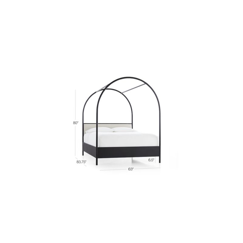 Sleek and sheltering, our exclusive Canyon canopy arcs a modern sleep statement in black metal tubing. Solid metal bed rails launch the dramatic, barrel-shaped canopy with rods at the top for gauzy draping. Designed by Leanne Ford, the bed frame squares off a headboard neatly upholstered in neutral polyester.