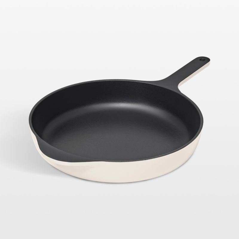 Caraway's charming minimalist style updates classic cast iron cookware for the modern kitchen. Three layers of black porcelain enamel coat the interior of this hand-finished skillet, giving it a scratch-resistant, non-stick finish. The ultra-durable cast iron retains heat impressively, no seasoning required. Triple-glazed creamy white on the exterior, the skillet has a fresh, understated look on the stove, pot rack or dining table.