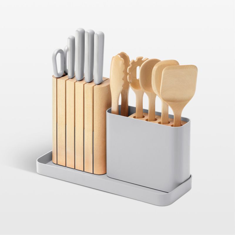 Outfit your kitchen in Caraway's signature modern minimalism with this streamlined prep set. Four essential kitchen knives and a pair of shears—all with hand-sharpened blades and sleek grey handles—nestle within the linear block crafted of sustainably sourced birch. Five hand-sanded utensils made of the same wood store upright in a birch block within a grey utensil container. The matching tray corrals all components to keep your countertop organized and attractive. A useful housewarming, graduation or wedding gift, this set includes an 8-inch chef's knife, 7-inch 6.5-inch prep knife, 3.5-inch paring knife, kitchen shears, spoon, server, scraper, spatula and tongs in a modular storage system.