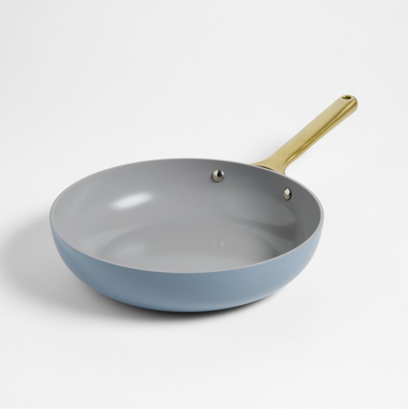 Caraway's modern, minimalist cookware in a blue inspired by serene lagoons that you'll only find at Crate & Barrel. Adorned with a gleaming gold-finished handle that adds a subtle touch of glam, this display-worthy frying pan is a joy to use. The aluminum skillet conducts heat evenly and efficiently, while the ceramic coating provides superior non-stick performance. Ideal for cooking everything from pancakes to steaks, our exclusive fry pan goes beautifully from stove to oven to table.