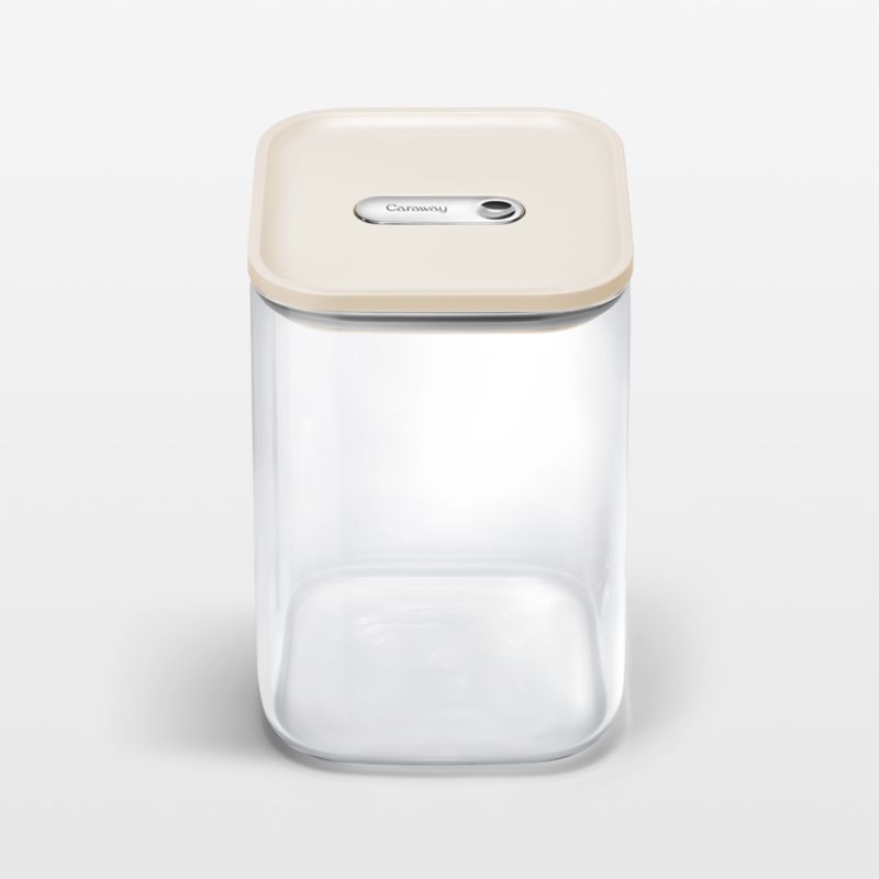 Neat, organized and freshness-protecting food storage is yours with this container from Caraway. The glass container resists scratches, stains and odors, providing a clear view of what's stored inside. A cream-colored, ceramic-coated lid is precision engineered to lock in freshness and keep out air. Simply press the lock on the lid to engage the airtight seal. Pair the large stackable container with the other sizes for seamless, versatile food storage