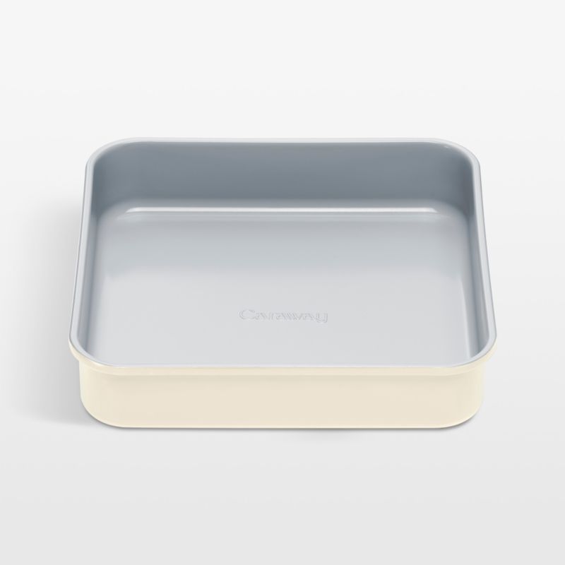 Bake blondies, cornbread or fruit crumbles in this essential baking pan. Finished in a naturally non-stick ceramic coating, the aluminized steel pan releases baked goods easily for quick cleanup. The cream-hued exterior gives the square pan a fresh look. Pair with other Caraway Home bakeware to build a modern collection.