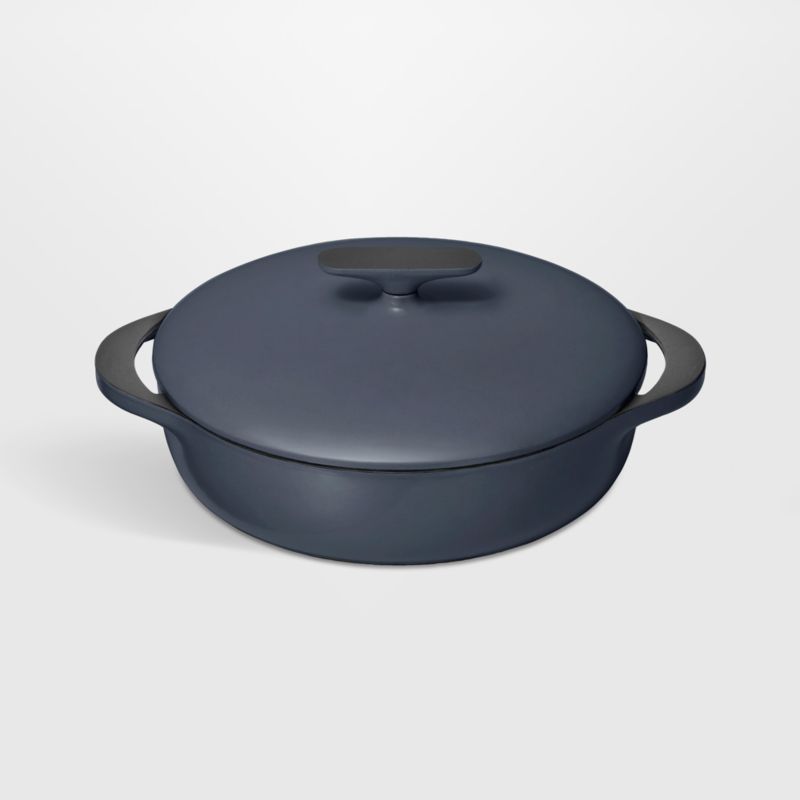 Caraway's charming minimalist style updates classic cast iron cookware for the modern kitchen. Three layers of black porcelain enamel coat the interior of this hand-finished braiser, giving it a scratch-resistant, non-stick finish. The ultra-durable cast iron is exceptional at retaining heat—no seasoning required—while the lid seals in warmth and moisture for perfectly cooked chicken and dumplings, pot roast or bread. Triple-glazed deep navy blue on the exterior with chic black accents, the braising pan has a fresh, understated look on the stove or dining table.