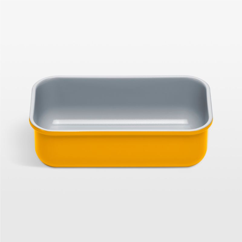 Bake snacking cakes, quick breads or meatloaf in this essential baking pan. Finished in a naturally non-stick ceramic coating, the aluminized steel loaf pan releases baked goods easily for quick cleanup. The yellow-orange exterior inspired by marigolds gives the pan a fresh look. Pair with other Caraway Home bakeware to build a modern collection.