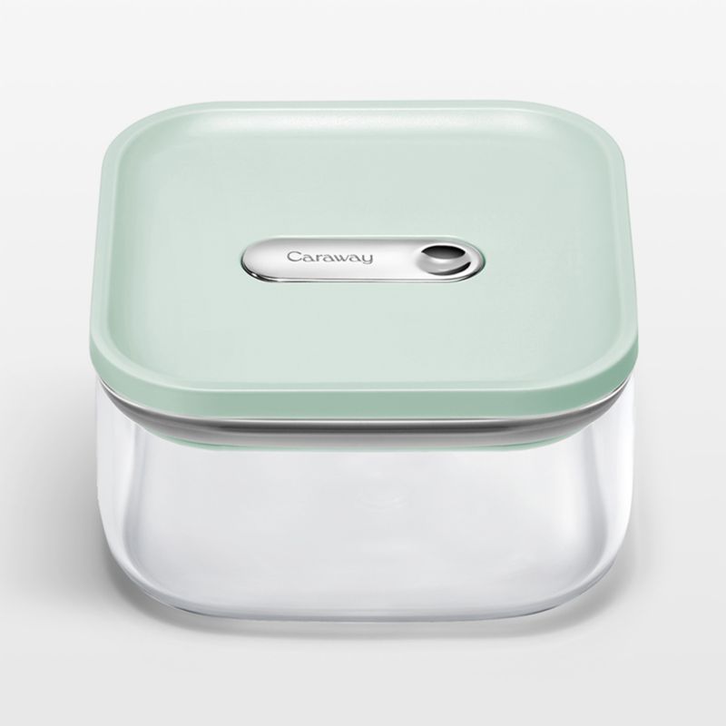 Neat, organized and freshness-protecting food storage is yours with this container from Caraway. The glass container resists scratches, stains and odors, providing a clear view of what's stored inside. A ceramic-coated lid is precision engineered to lock in freshness and keep out air. Simply press the lock on the lid to engage the airtight seal. Pair the small stackable container with the other sizes for seamless, versatile food storage