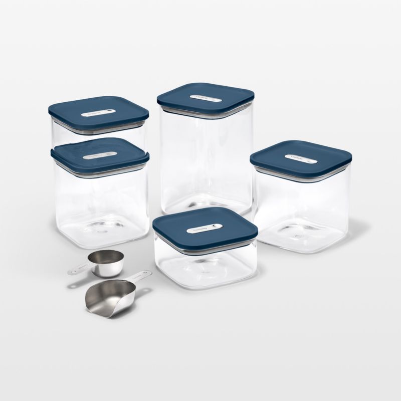 Neat, organized and freshness-protecting food storage is yours with this 14-piece set from Caraway. Glass containers in three sizes are scratch-, stain- and odor-resistant, providing a clear view of what's stored inside. Navy blue-colored, ceramic-coated lids are precision engineered to lock in freshness and keep out air. Simply press the lock on the lid to engage the airtight seal. The stackable jars fit neatly into the included organizer to maximize space in the pantry or on the counter.