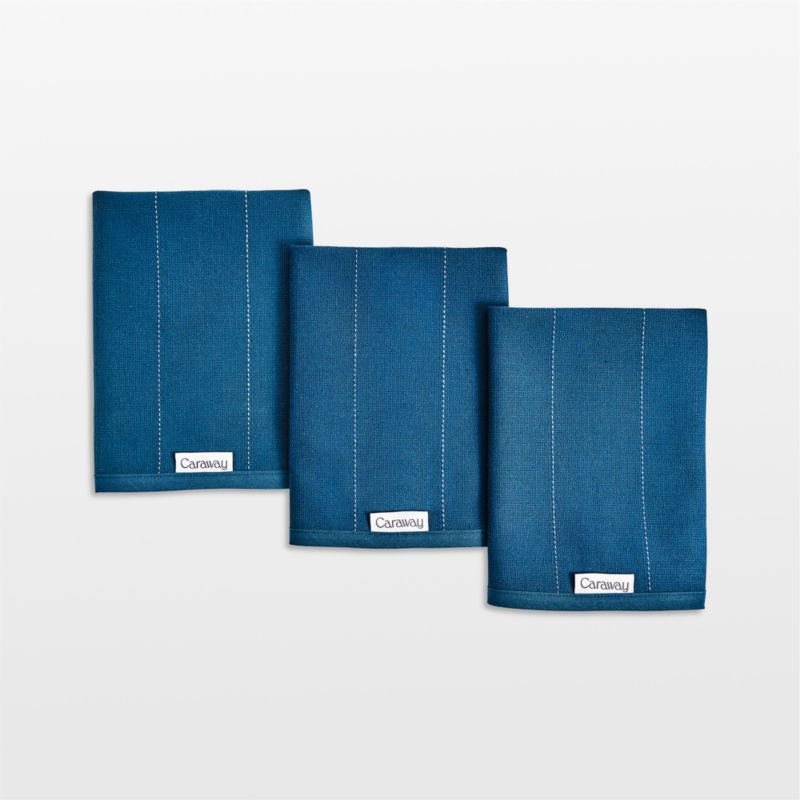 Designed to coordinate with Caraway cookware, this set of three tea towels are high absorbent, line-free and oversized. Made of organic cotton in navy blue, the dish towels charm with design-savvy details in the grey stitched stripes, rounded corners and hanging loop integrated into the welt-seam borders.