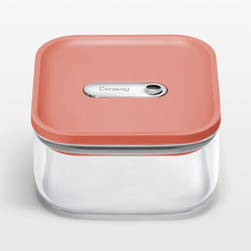 Neat, organized and freshness-protecting food storage is yours with this container from Caraway. The glass container resists scratches, stains and odors, providing a clear view of what's stored inside. A ceramic-coated lid is precision engineered to lock in freshness and keep out air. Simply press the lock on the lid to engage the airtight seal. Pair the small stackable container with the other sizes for seamless, versatile food storage