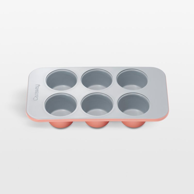Bake a half-dozen muffins, cupcakes or individual frittatas in this must-have mini muffin pan. Finished in a naturally non-stick ceramic coating, the aluminized steel pan releases baked goods easily for quick cleanup. The perracotta (Caraway's distinctive pink and terracotta hue) exterior gives the muffin tin a fresh look. Pair with our other Caraway Home mini pans to build a modern bakeware collection perfectly sized for small-space kitchens and compact ovens.