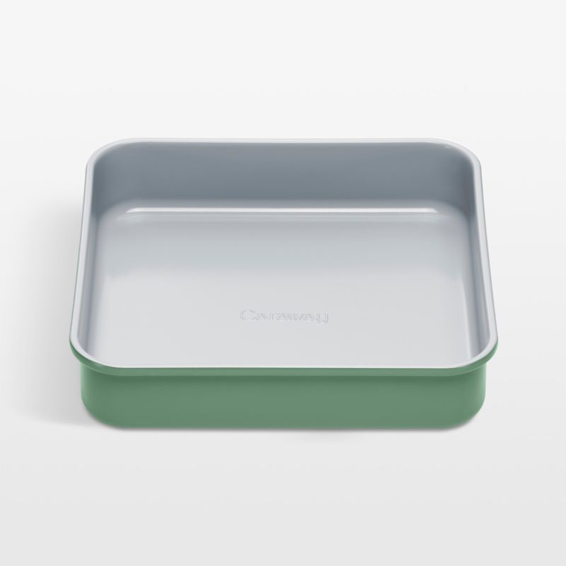 Bake blondies, cornbread or fruit crumbles in this essential baking pan. Finished in a naturally non-stick ceramic coating, the aluminized steel pan releases baked goods easily for quick cleanup. The sage green exterior gives the square pan a fresh look. Pair with other Caraway Home bakeware to build a modern collection.