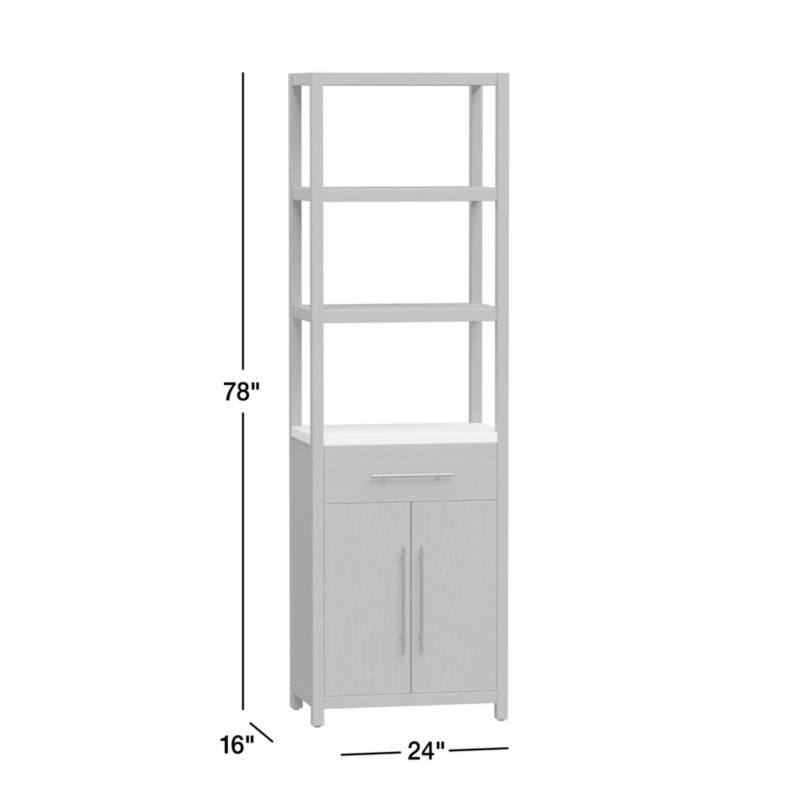Designed to complement our Carmen sink vanities, this black storage tower rises high to host towels, toiletries and other bathroom essentials. Three shelves, one contrasting in white Volakas marble, provide ample open storage. Below, a single drawer and a roomy cabinet with an adjustable interior shelf are accented with a vertical and horizontal mix of slim cylindrical bar pulls. Built to last, the Carmen bathroom tower is a Crate & Barrel exclusive.