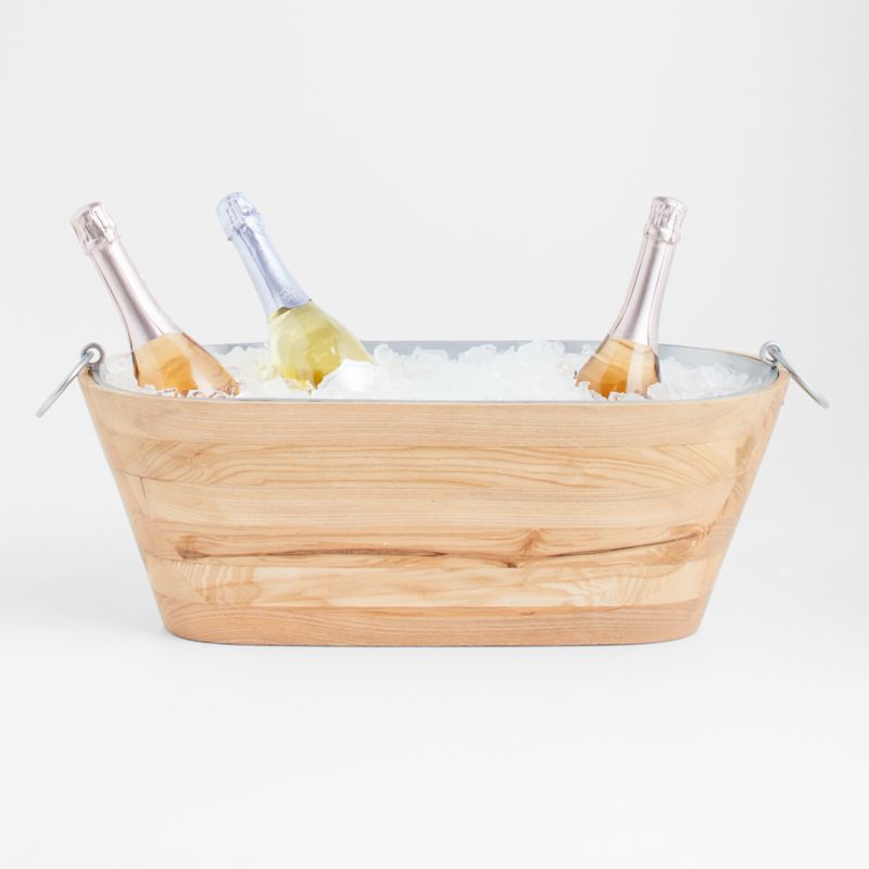 Chill a party's worth of wines, beers and sparkling waters in warm, organic style just right for entertaining indoors or out. Stunningly grained ash wood, laminated and finished by hand, curves a tapered oval tub. The gleaming galvanized liner boasts ring handles, making it easy to move the iced drinks from the kitchen to the festivities. Pair with the other pieces in our exclusive Carson serving collection for unified entertaining.